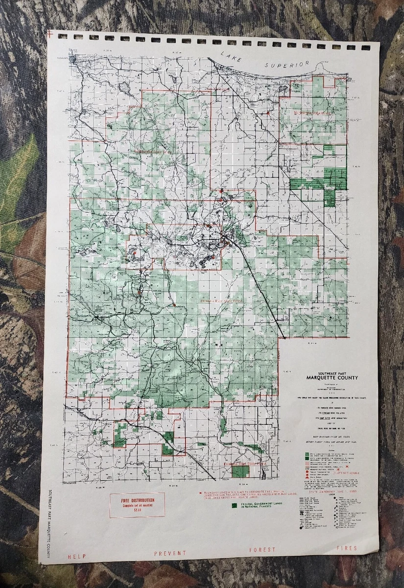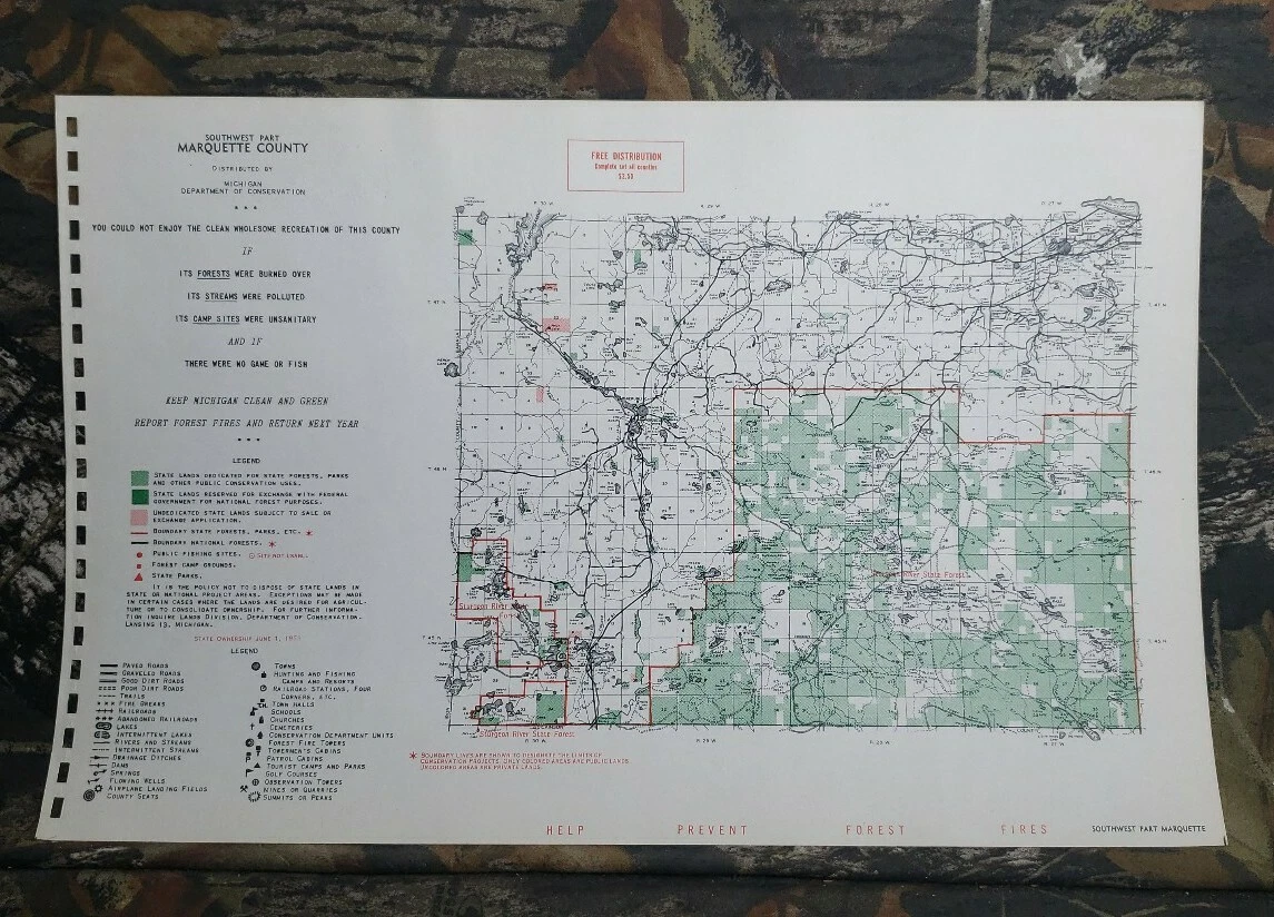 Vtg 1955 Southeast Part Marquette County MI Dept Conservation Plat